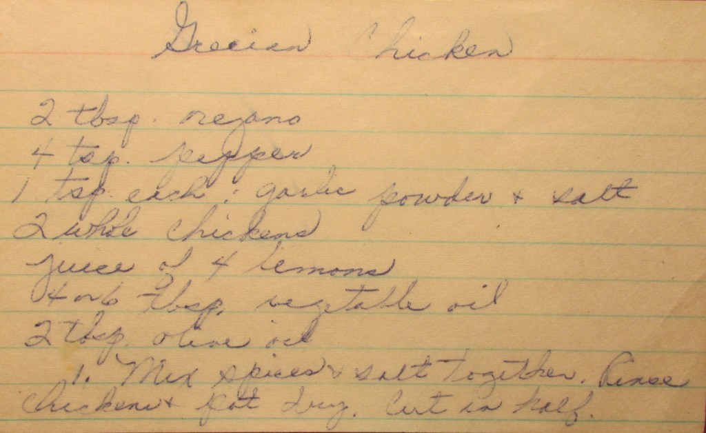 As Dusty and I sorted through Jane’s recipe collection, we were very surprised to find four recipe cards for this flavorful chicken dish! Since all the recipes were virtually exactly the same, we assumed that this must have been one of her favorites! Even though neither Dusty or I remember Jane preparing and serving this recipe, we felt compelled to give it a try and we’re really glad that we did! The grilled chicken is moist, tender, and juicy! Delicious!