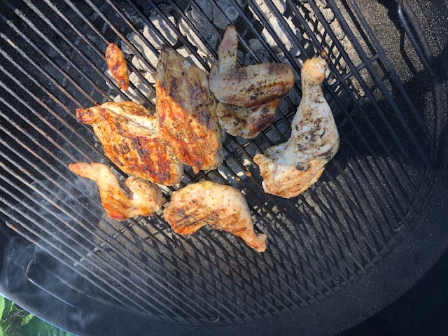 - Grill about 45 minutes in covered grill, turning and basting with marinade every 5 to 10 minutes. Note: The safe internal temperature of cooked chicken is 165 degrees F.