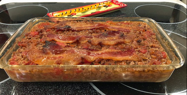 This simple casserole recipe was very popular in the Marlow household when I was growing up! It’s actually little more than baked beans with ground beef added, but the combination makes a delicious main dish that’s both savory and oh so slightly sweet. I’m sure the fact that the ingredients in Saturday Nite Special are also inexpensive pantry staples made it appealing to a mom on a budget. The brown sugar added to the bacon that tops the casserole give the dish a very modern twist!