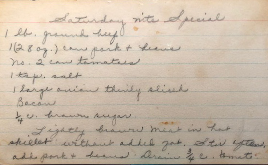 Being the rule breakers that we are, Dusty and I prepared Saturday Nite Special for dinner on Sunday evening. LOL We followed the recipe as it appears on Beulah’s recipe card pictured above with one deviation. We replaced the pork and beans with a can of Bush’s Best Original Baked Beans, which added some extra flavor to the dish. I think my mom would approve. Served with some crusty bread and a fresh vegetable salad, Saturday Nite Special was just as tasty and satisfying as I remembered!