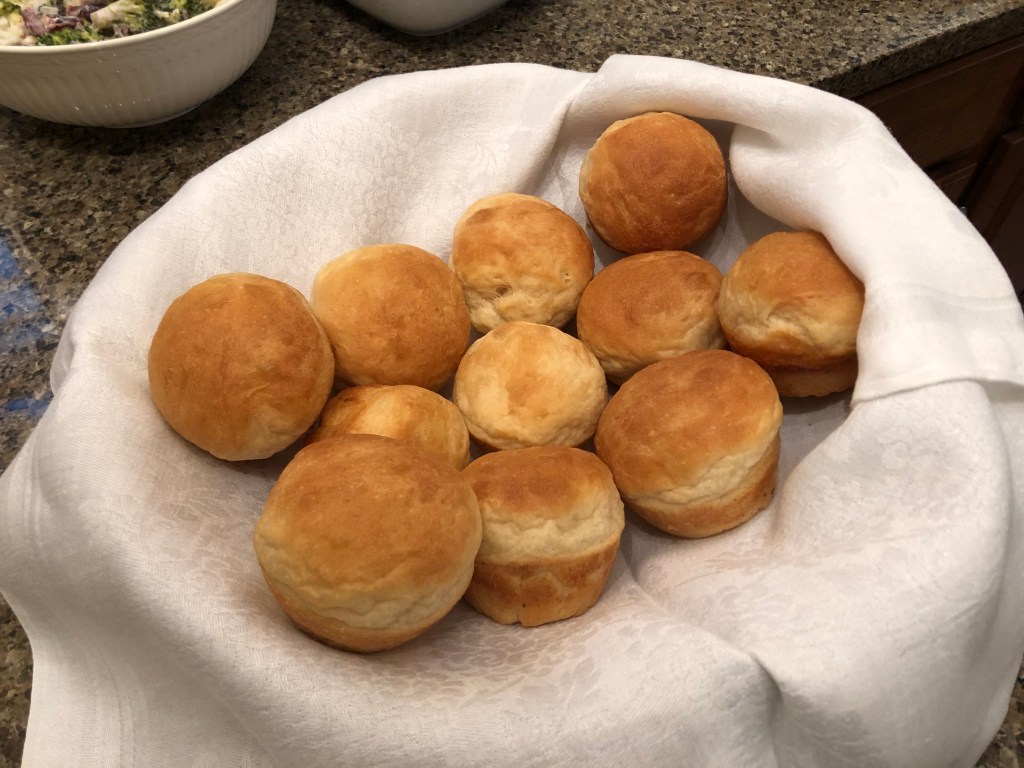 When I was growing up, one thing I could always count on was that there would be a large mixing bowl in the refrigerator that contained the batter for these light-as-air dinner rolls. These rolls were my Mom’s secret weapon! Knowing that rolls hot from the oven would elevate even the most ordinary menu to memorable, she always kept the batter on hand. She would stir the batter down occasionally and the cool temps in the refrigerator kept the dough in a sort of state of suspended animation, ready to spring to life with the warmth of the oven. The recipe is virtually foolproof and nothing smells any more divine than the aroma of these beauties as they bake.