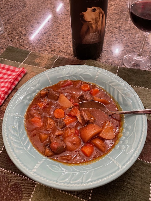Now a word about the Long Shot Beef Stew recipe. Dusty and I are charter members of the Read Between the Vines book club, which meets at the original Feather Hills Tasting Room at 410 Thorn Lane, Makanda. Formerly known as Orlandini’s Winery, it’s one of the oldest wineries on the Shawnee Hills Wine trail. January is my month to select a book for the group to read and I chose The Trackers by Charles Frazier. I selected this book because it’s set in Depression Era America, a very challenging time in our history and similar in many ways to the post-pandemic period in which we’re living now. I’m hoping that the novel will inspire some good discussion at our next book club meeting on February 8. All book and or wine lovers are welcome to attend, BTW!